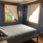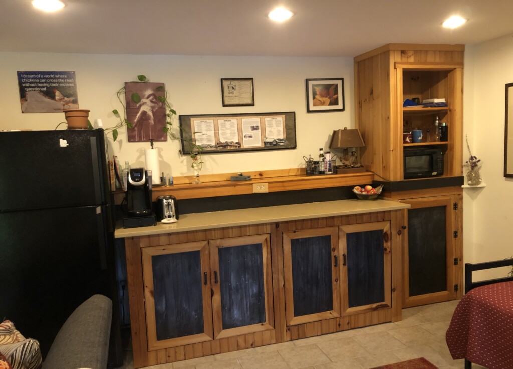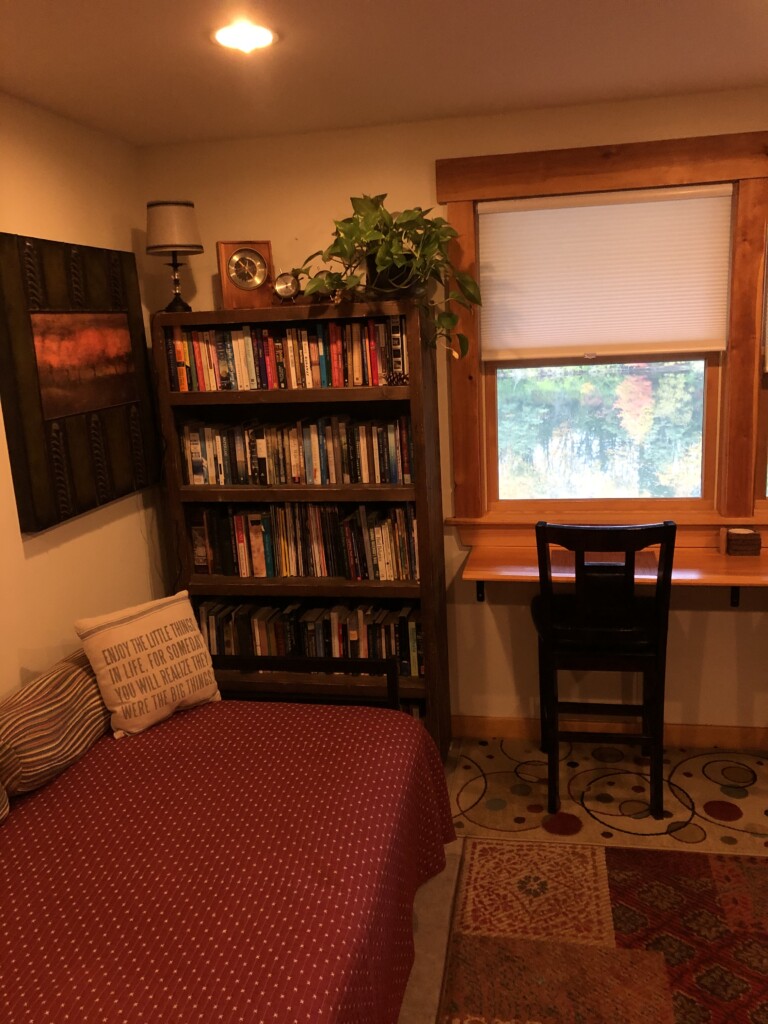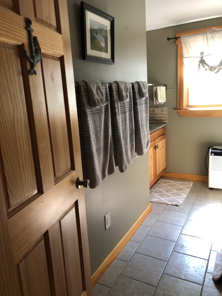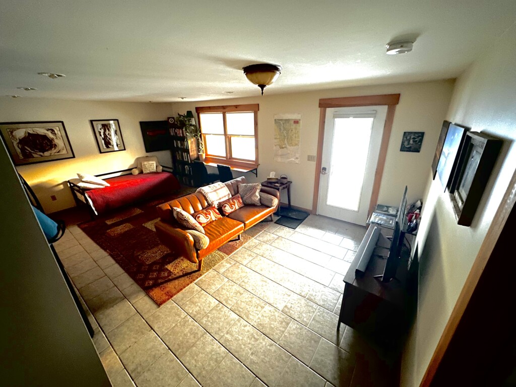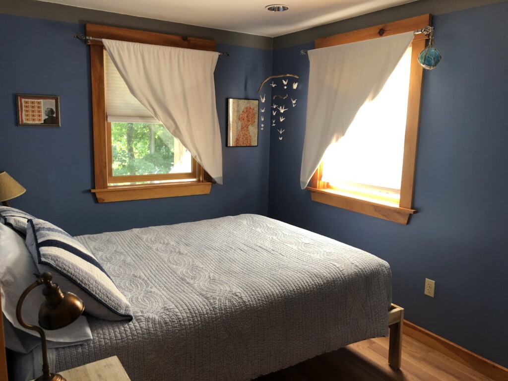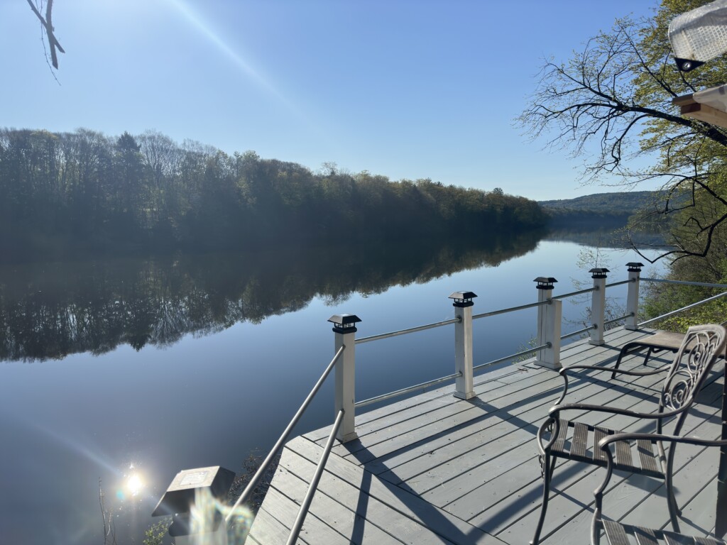 Lowest floor in owner-occupied home, super fast internet, on a state-maintained road, and 5 minutes to the interstate. Living room, bathroom with great shower, bedroom with a queen bed, closet, bureau, basic kitchen with scheduled access to full kitchen upstairs. Private entry and private outdoor patio with table seating. Shared dock, kayaks, and river decks.