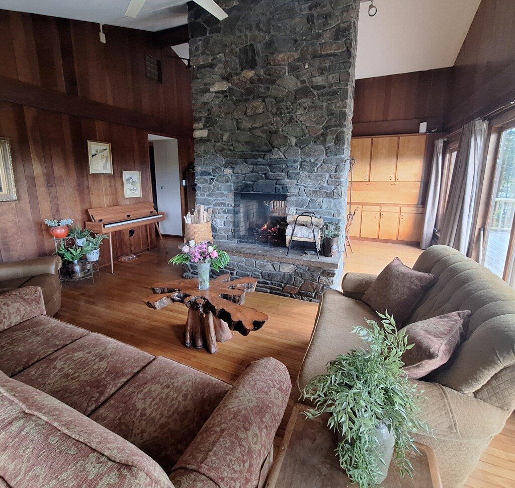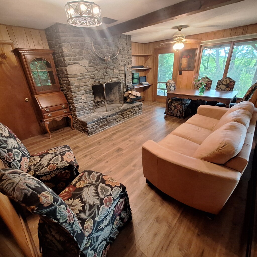 Step inside to a warm and inviting interior, anchored by a central stone fireplace that seamlessly connects the spacious living and dining areas featuring vaulted ceilings—perfect for cozy gatherings. Large windows frame breathtaking views of a neighboring apple farm, hillsides, and majestic Mount Killington, showcasing vibrant sunsets that will leave you in awe. The wraparound deck invites you to relax and soak in the natural beauty, ideal for morning coffee or evening entertaining. The upper floor features two bedrooms and one full bathroom, full kitchen, dining room, and living room.